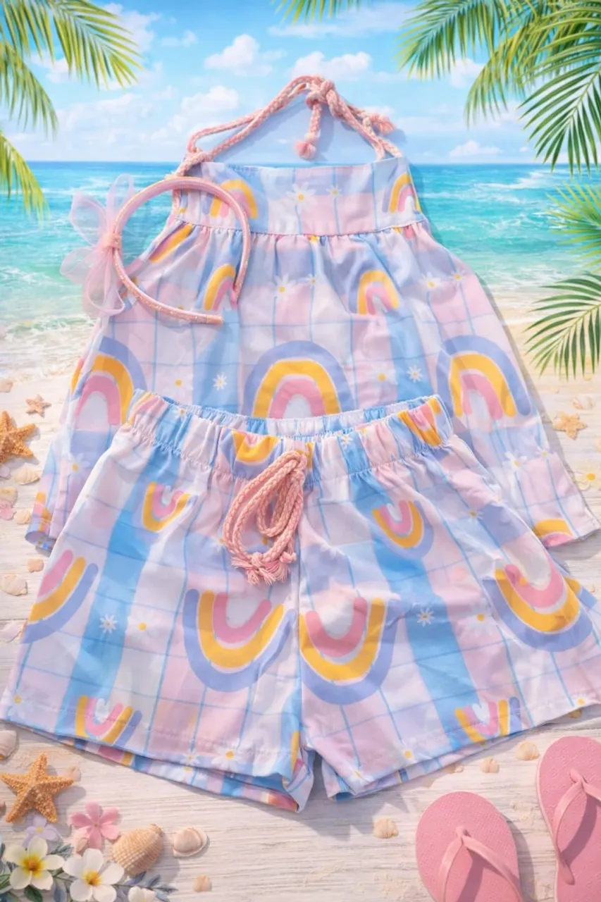 Lindo conjunto infantil, perfeito para os dias de sol! Com um design alegre e colorido, este conjunto traz conforto e estilo para as crianças. Ideal para brincar na praia ou em qualquer ocasião especial. Blusa e short