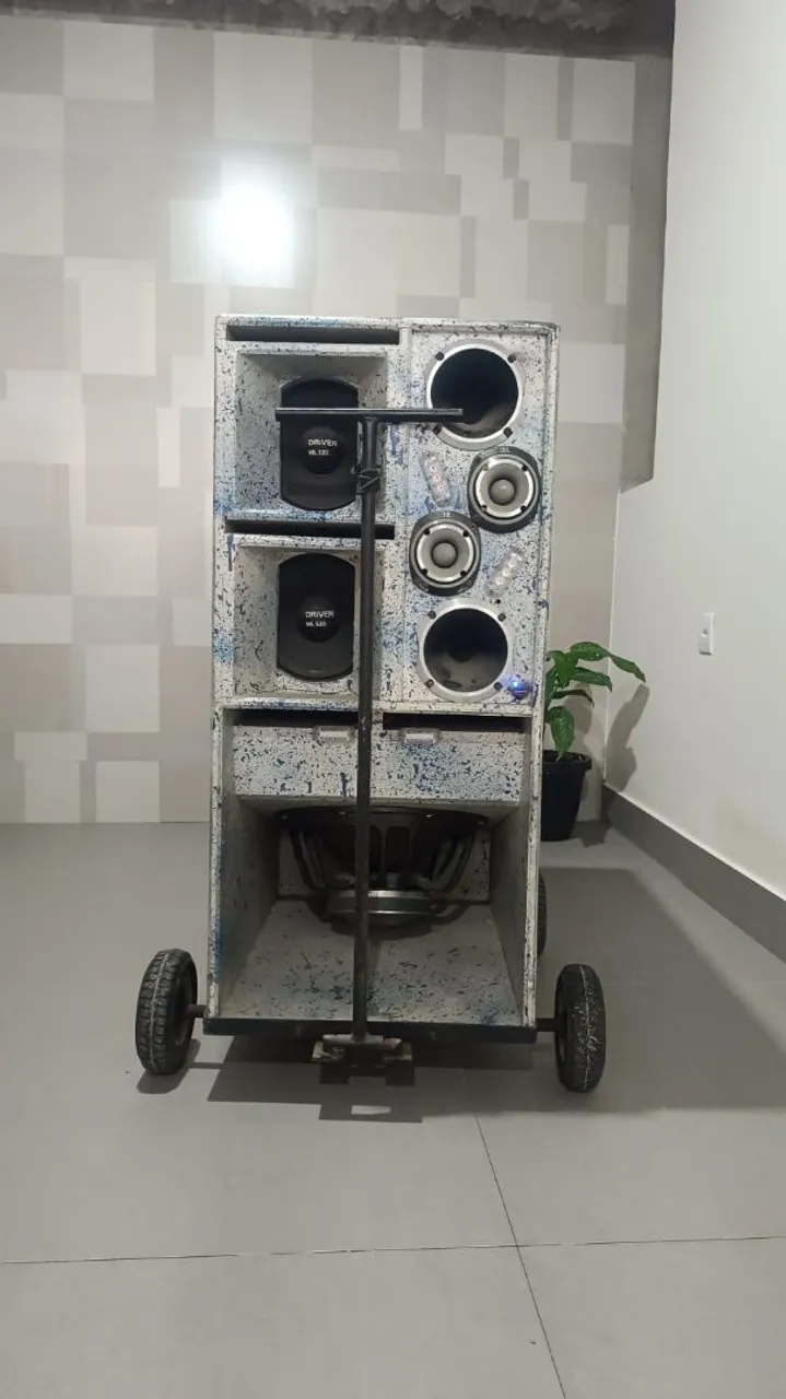 Potente caixa de som com diversos drivers e alto falantes, ideal para festas e eventos. Som de alta qualidade. ? 1 fonte Taramps 120 AH inteligente ? 1 módulo teranps HD 5000 ? 1 módulo teranps DS 800x4 ? 1 auto falante 7 drive SL 3.1 k 18? ? 2 médio graves 7 drive ML 520 10? ? 2 cornetas 305 trio JBL ? 2 super tweeter ST 450 JBL ? 2 bateria estacionária 105AH moura ? 1 processador Stetsom STX 2448 ? 1 estrobo ? 1 controle longa distância ? 2 cone cornetas Selenium ?1 Voltímetro ? Aparelho Pioneer mx3000 ? Carrinho reforçado com pneu maciço reforçado ?Obs: $9k dividido em 6 vezes no cartão ou $7,5k a vista?