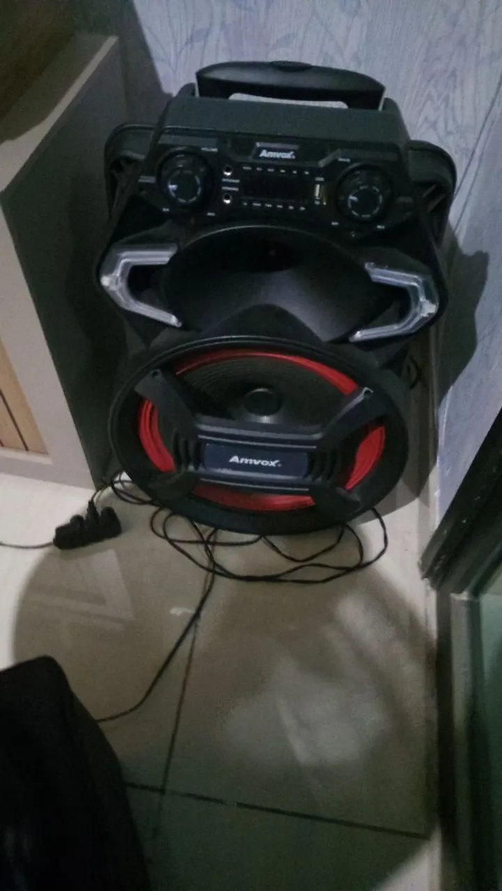 Potencialize suas festas com esta caixa de som Amvox! Som potente e design moderno para animar qualquer ambiente. Está com o volume baixo.