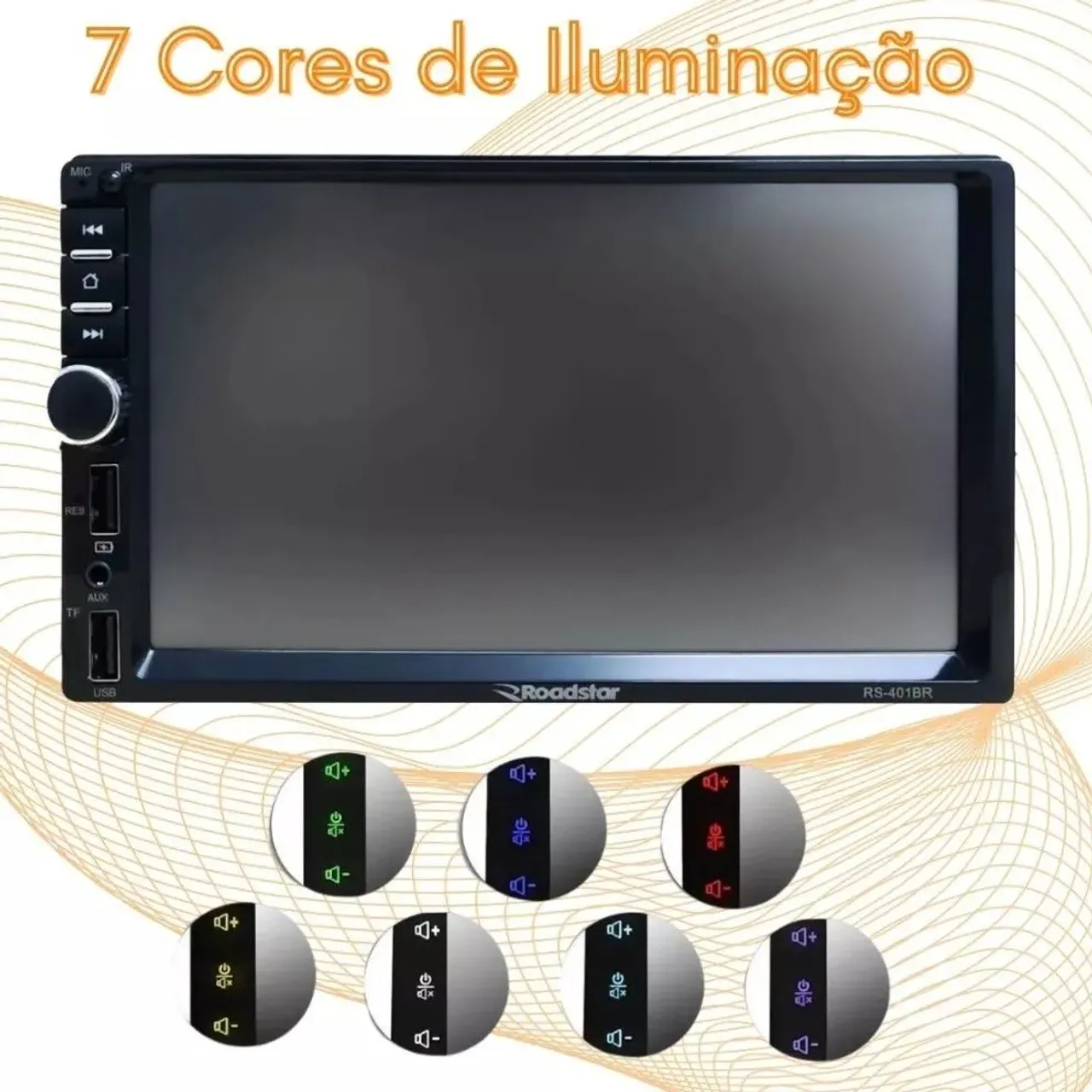 Som automotivo Roadstar com 7 opções de cores para você personalizar. Conectividade USB e design moderno para o seu carro. 2 Din