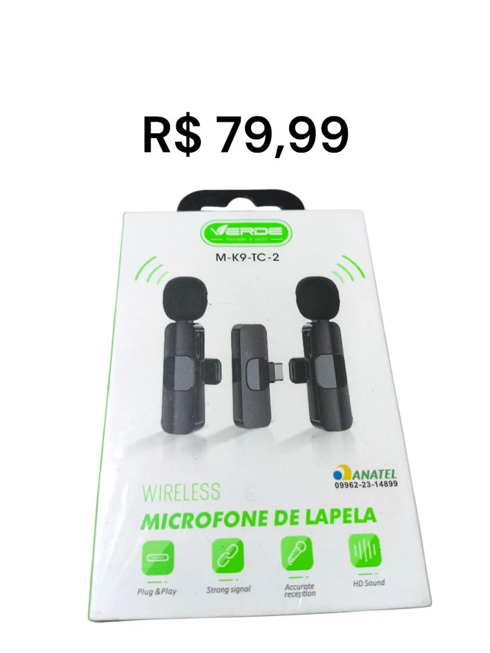 Microfone de lapela sem fio Verde M-K9-TC-2, perfeito para quem busca áudio de alta qualidade com fácil instalação e sinal forte. Ideal para vlogs, entrevistas e gravações em geral. Plug and play, com recepção precisa e áudio HD.