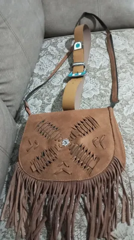 Conjunto de bolsa e cinto em tom neutro, cinto de couro, bolsa em material couro com franjas.