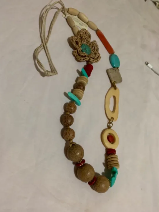 Colar colorido, contas de madeira e coloridas, flor de Crochê. Muito bom acabamento.