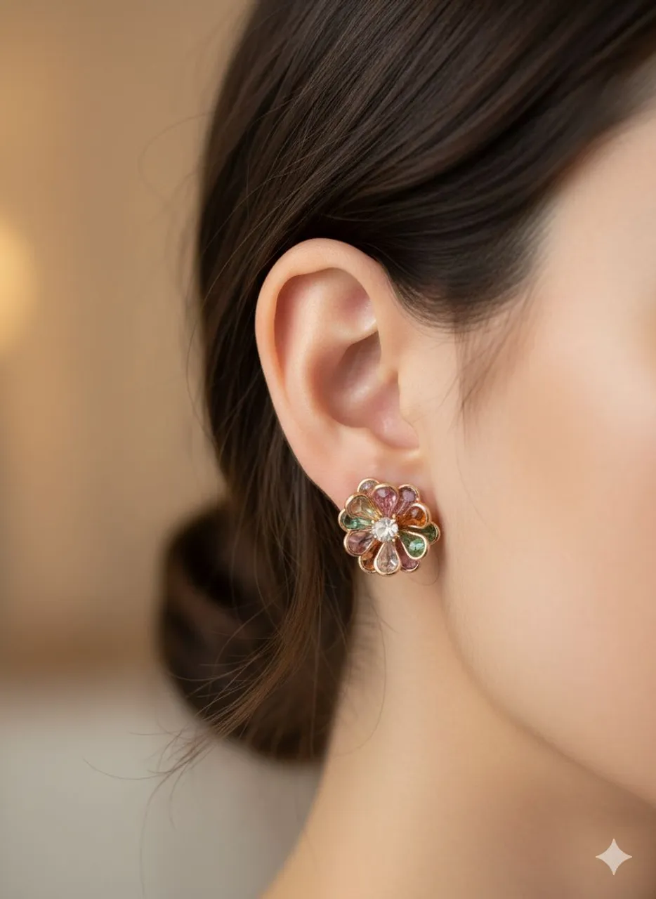 Brincos semi jóias com design floral e pedras coloridas, perfeitos para dar um toque de charme e sofisticação ao seu visual. Leves e confortáveis, ideais para qualquer ocasião!
