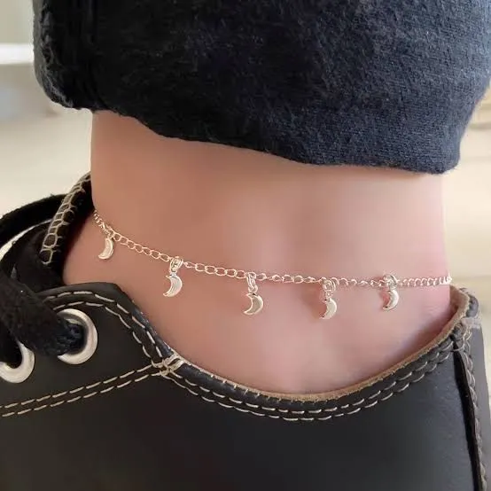 Tornozeleira de prata com pingentes de lua, perfeito para dar um toque especial ao seu visual. Design elegante e moderno.