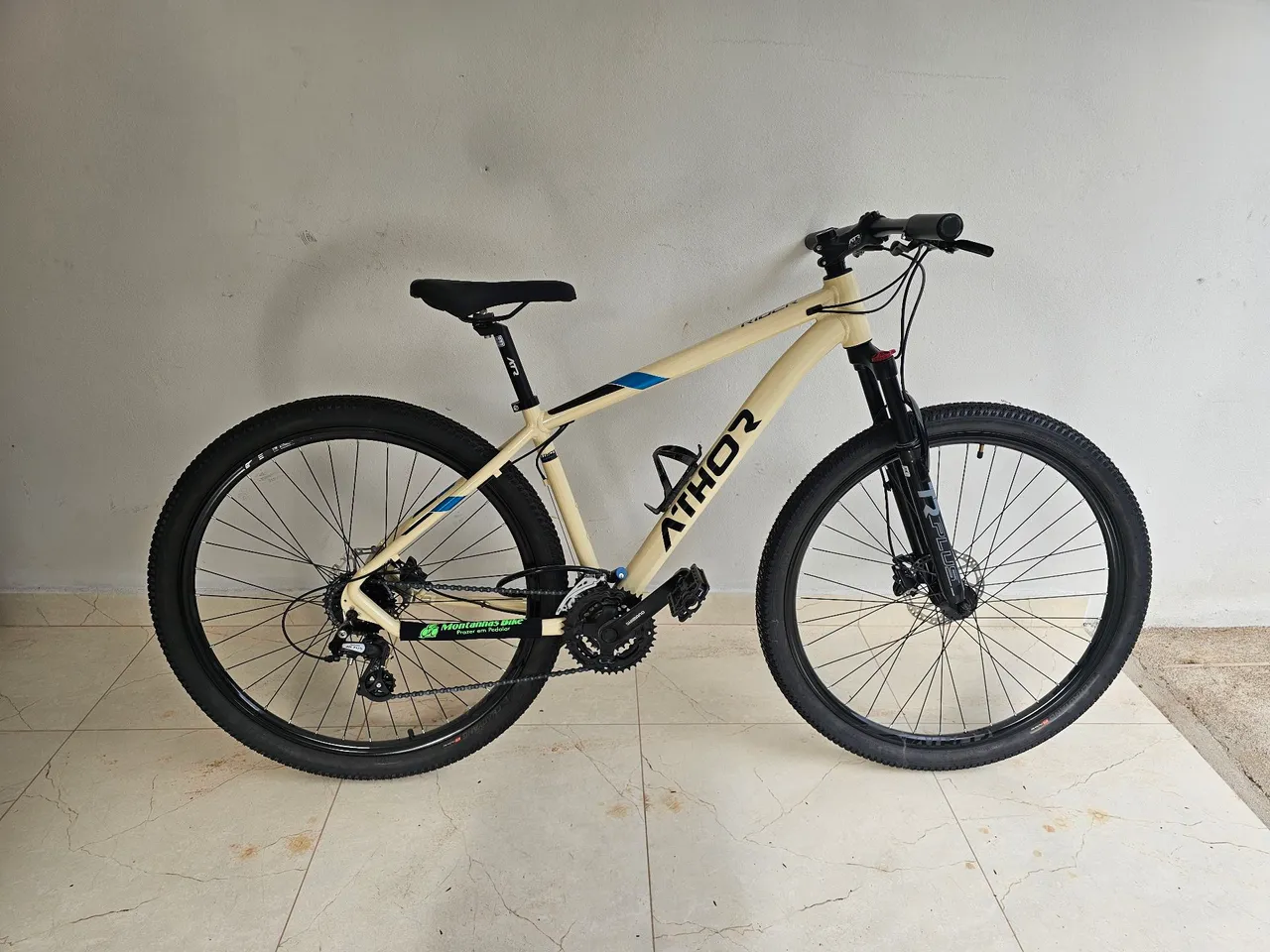 A bike está nova, com nota fiscal e garantia da loja, usada apenas uma vez na rua. O conjunto é shimano, suspensão com trava hidráulica.
