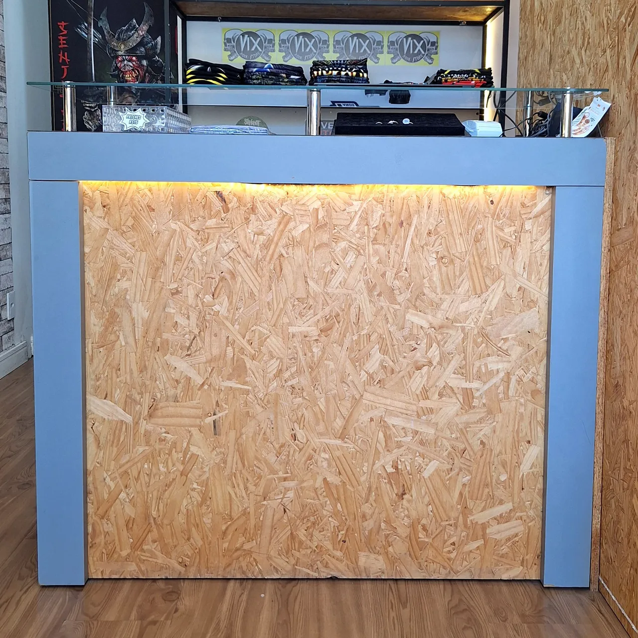 Balcão para loja em madeira, duas gavetas e compartimentos internos.