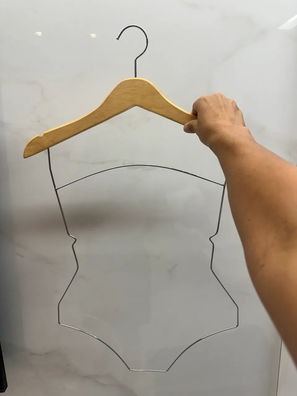 Cabides em madeira para loja, ideais para expor biquínis e outras peças de roupa. Design moderno e elegante, perfeito para valorizar suas roupas.