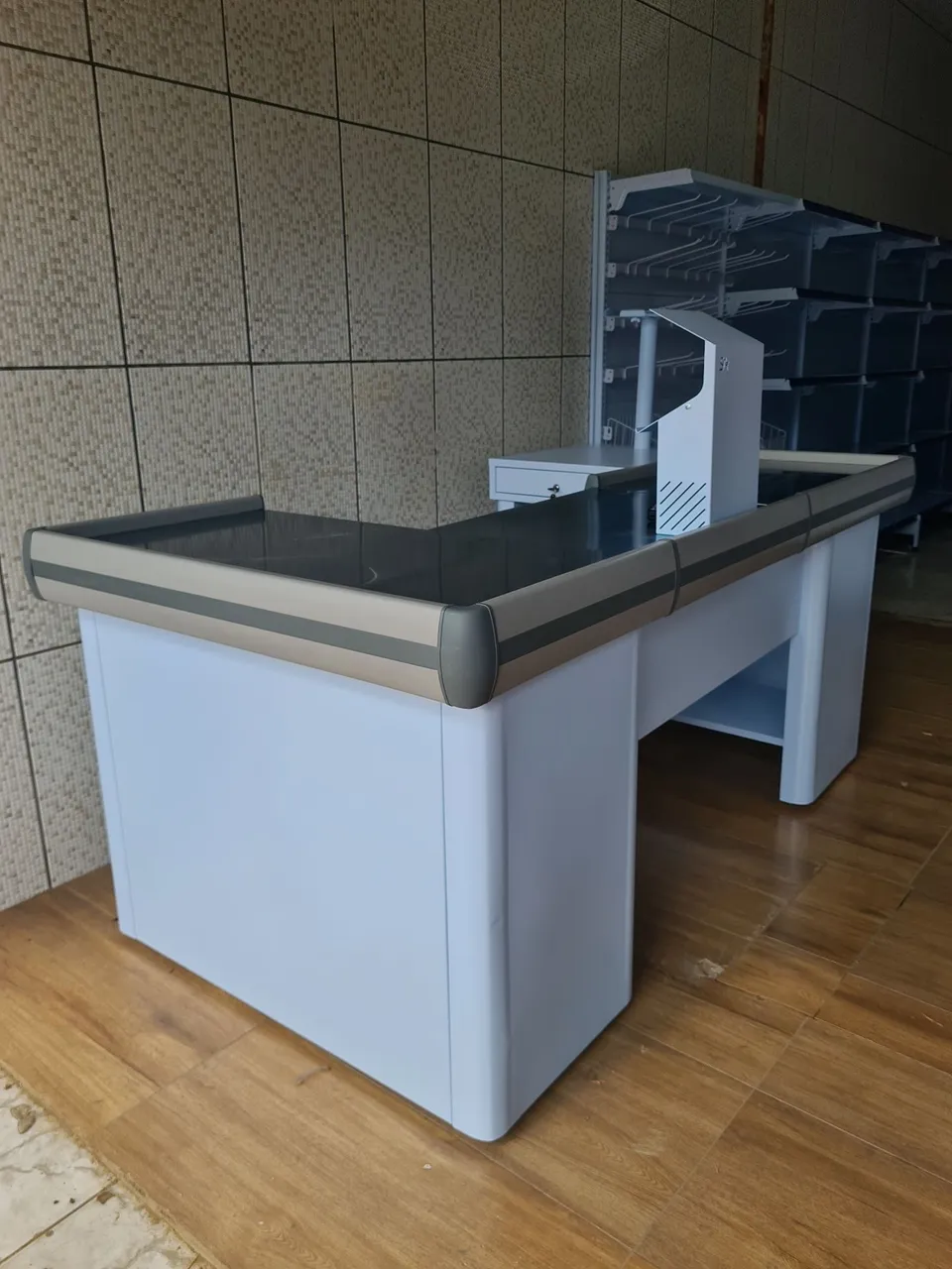 Caixa de supermercado com design moderno e funcional, ideal para otimizar o atendimento e organização do seu estabelecimento comercial. Para mais informações: