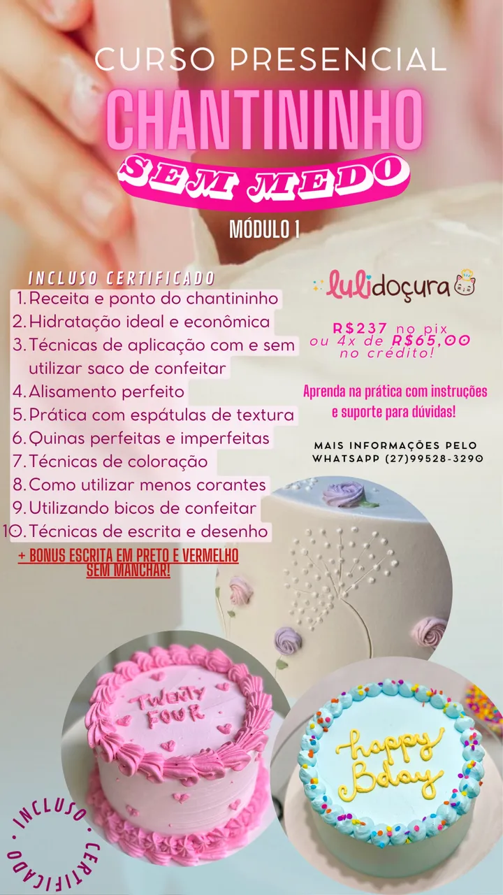Aprenda a fazer bolos incríveis com a técnica do chantininho! Curso presencial com certificado, ensinando receitas, hidratação, aplicação, alisamento e muito mais. Técnicas de escrita e desenho inclusas. Domine o chantininho!
