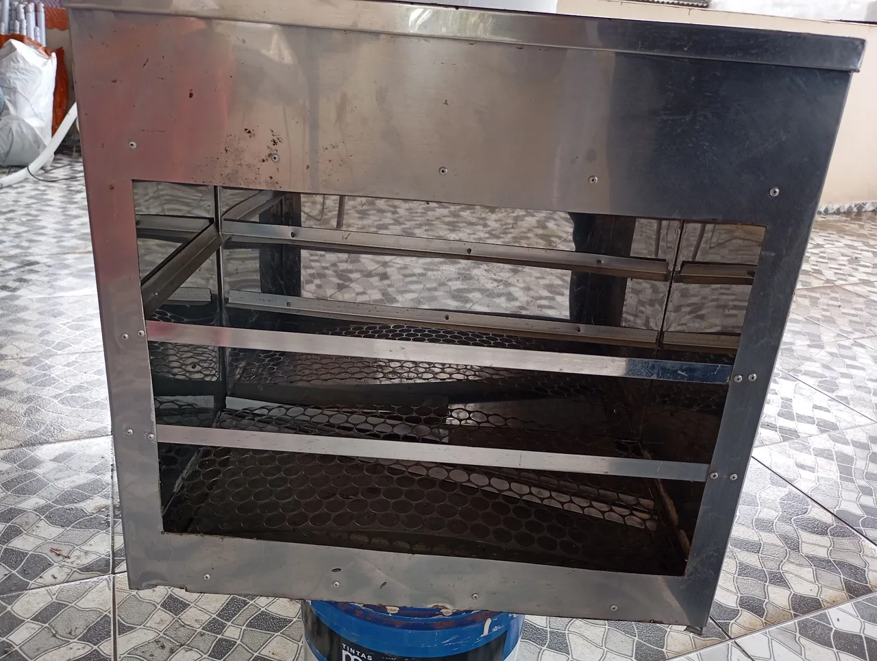 Assador/Aquecedor de alimentos em aço inox, ideal para restaurantes e lanchonetes. Possui prateleiras e grelhas para otimizar o espaço.