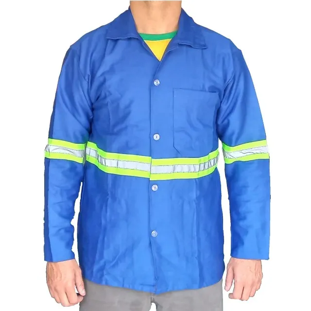 Uniforme de trabalho azul com faixas reflexivas, ideal para segurança e visibilidade. Conforto e durabilidade para diversas atividades. Tecido brim leve, 100% algodão.