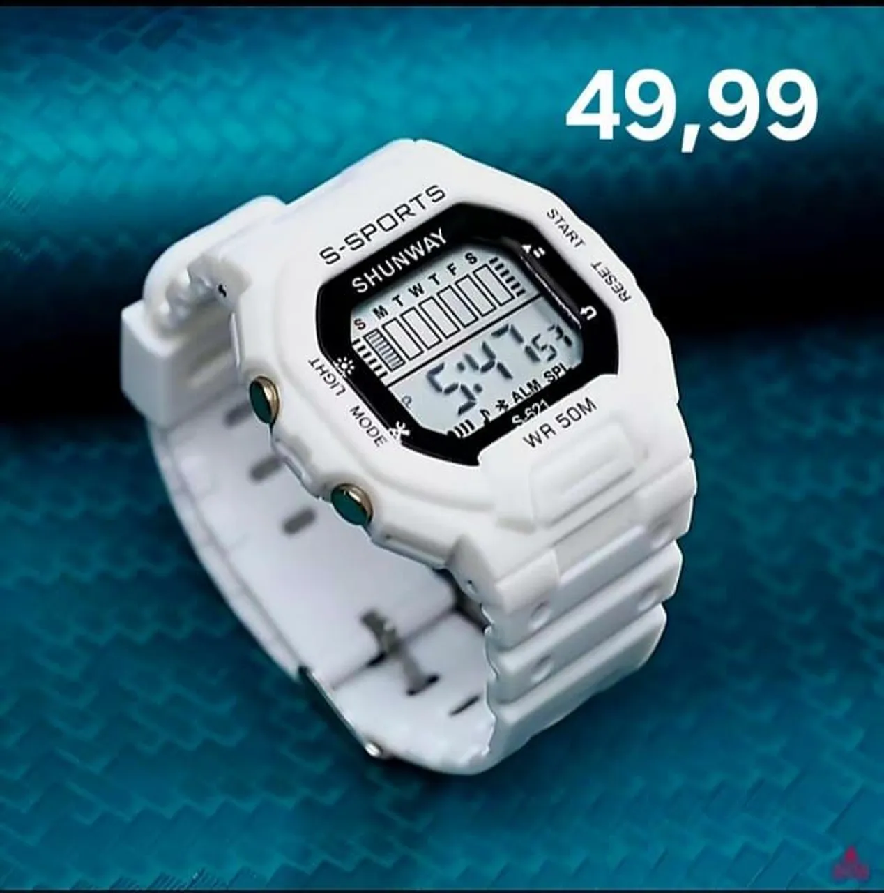 Relógio digital esportivo com design moderno e diversas funções. Ideal para quem busca estilo e praticidade no dia a dia. Resistente à água e com ótima visibilidade.