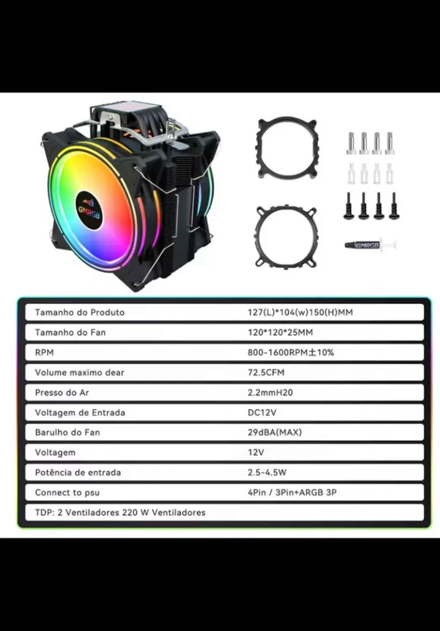 Este Air Cooler é a solução perfeita para manter seu PC com ótimo desempenho! Com iluminação RGB vibrante, design moderno e eficiente, este cooler garante refrigeração superior e visual incrível para seu setup.