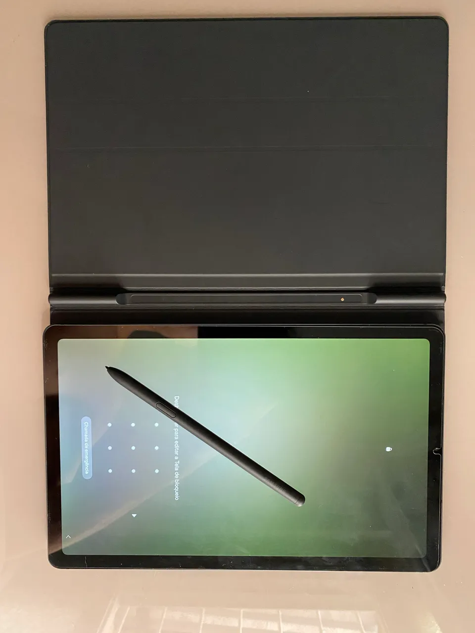 Tem caneta, carregador, capa, película, teclado e mouse.