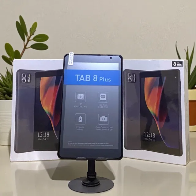 Tablet Pritom TAB8 Plus, com tela IPS HD, Android 13, processador Octa-Core, 4GB RAM (expansível para 8GB) e 64GB de armazenamento (expansível até 1TB). Câmeras de 8MP e 2MP, bateria de 5000mAh, Wi-Fi 5G, Bluetooth e entrada USB-C. Atenção: a embalagem pode variar conforme a unidade.