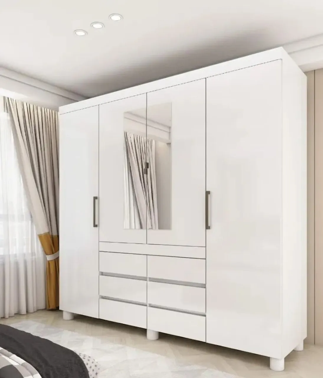O Guarda Roupa Casal com Espelho e Pés 4 Portas 6 Gavetas Império apresenta um design contemporâneo e prático. Sua estrutura interna é bem organizada, com prateleiras que proporcionam excelente capacidade de armazenamento