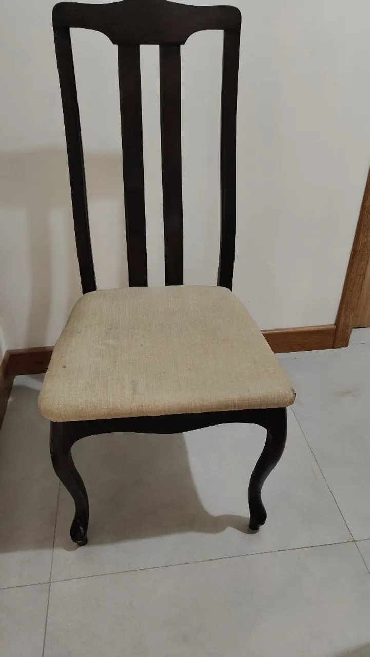 Cadeiras de madeira maciça com design clássico e elegante. Super resistentes, em tecido Acquablock (trocado recentemente), só precisa higienizar. Conforto e durabilidade garantidos!.