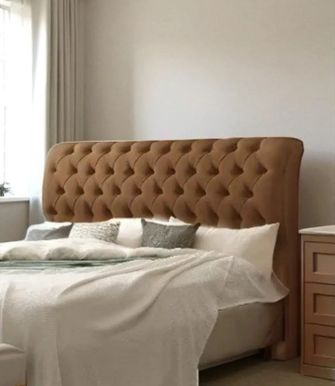 Linda cabeceira de cama estofada com design elegante e confortável. Detalhes em capitonê que adicionam sofisticação ao seu quarto. Perfeita para um ambiente aconchegante e charmoso.