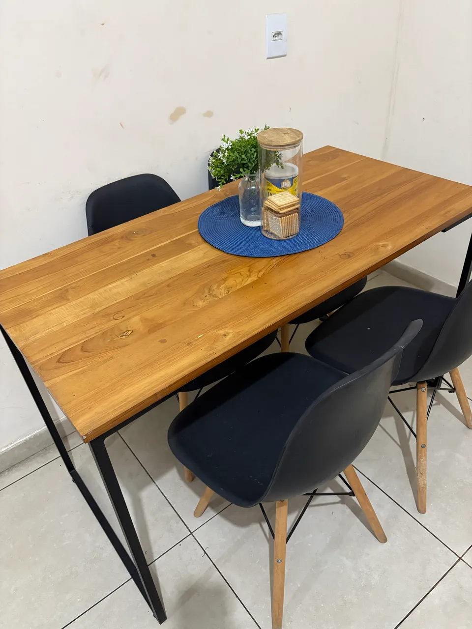 Conjunto de mesa de jantar com design moderno e elegante. Ideal para reunir a família e amigos em momentos especiais. A mesa possui um tampo de madeira que combina com as cadeiras pretas, criando um ambiente acolhedor e sofisticado.