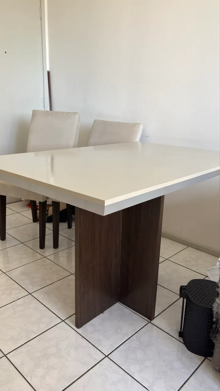 Mesa de 4 lugares usadas. Material MDF. Topo 0.8cm x 1.2cm, altura 0.8cm. O anúncio é de apenas a mesa. Tem duas cadeiras que estão um pouco soltas, caso queira elas são gratuita com a mesa.
