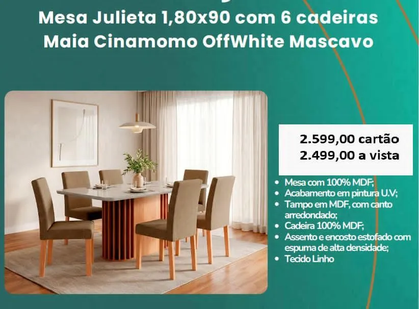 Apresentamos a elegante Mesa Julieta, perfeita para sua sala de jantar! Com design moderno e sofisticado, esta mesa de 1,80x90cm acomoda confortavelmente 6 pessoas. Seu acabamento OffWhite e detalhes em Cinamomo trazem um toque de requinte ao ambiente. Acompanha cadeiras com assento estofado para o máximo conforto. Transforme sua sala de jantar com esta peça única!
