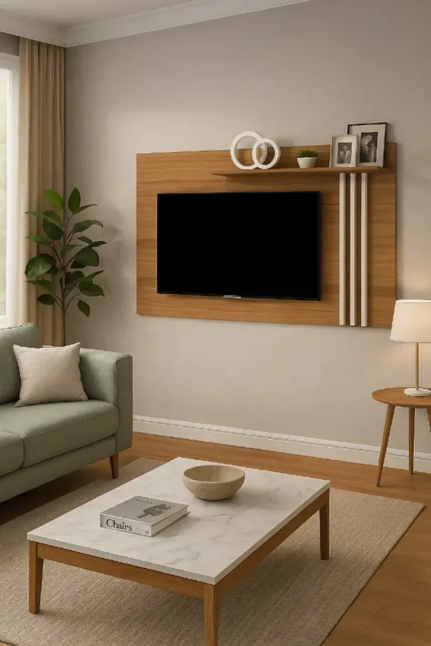 Além do espaço para tvs de até 65 polegadas, esse painel só dispõe de uma prateleira superior, que pode ser usada para acomodar aparelhos eletrônicos ou peças decorativas.