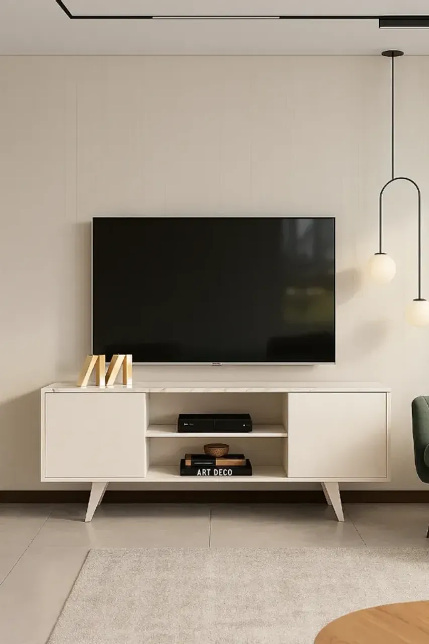 Rack elegante e funcional, ideal para sua sala de estar. Design clean e moderno, com espaço para TV e objetos decorativos. Perfeito para organizar e embelezar seu ambiente.