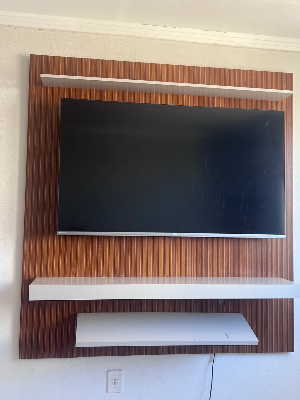 Painel para tv até 60 polegadas , para ode ser desmontado para facilitar o transporte médida media de 1,50 de largura por 1,80 de altura. É um painel bem pesado. Precisa de 2 ou mais pessoas para levar.