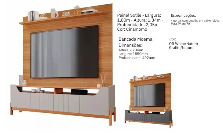 Rack com 1,85m de largura, 62cm altura e 40,2cm profundidade, R$ 750. Cores: Cinamomo, Off White/Nature ou Grafite/Nature. Ideal para TVs de até 70 polegadas.