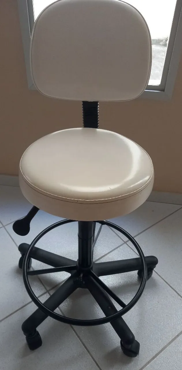 Micho giratório com encosto e base em metal, ideal para clinicas, salões e estética. Possui estrutura resistente e revestimento confortável. Perfeita para quem busca praticidade e conforto durante o trabalho. Ótimo para esteticista.