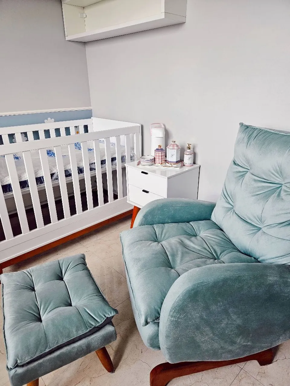 Poltrona de balanço, perfeita para amamentar ou para sua sala, companhada por um puff.