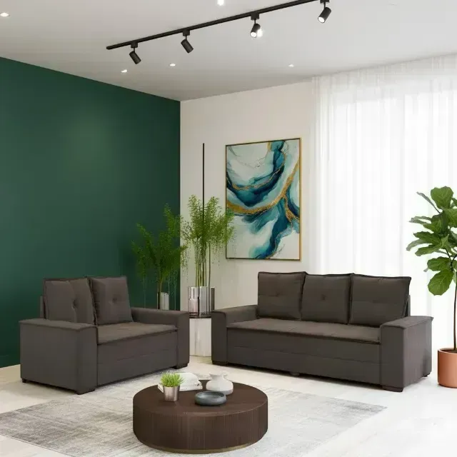 Conjunto de sofás Barcelona, perfeito para sua sala! Composto por um sofá de 3 lugares e um de 2 lugares, ambos na elegante cor marrom