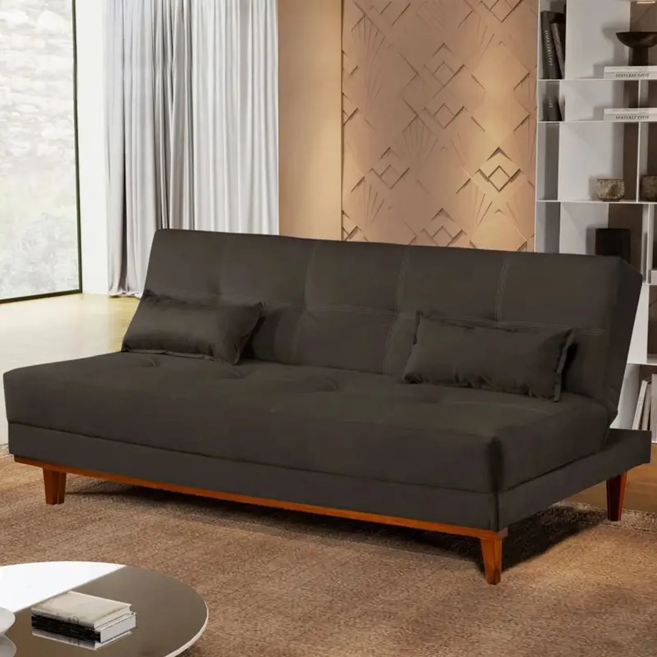 Este sofá cama acomoda tranquilamente 3 pessoas sentadas e duas deitadas, ele pode ser utilizado em 02 posições diferentes, espumas de alto conforto com a densidade tanto no assento como no encosto Espuma D-28, com percintas elástica e molas espirais , pés em madeira, acompanha 2 almofadas que podem ser usadas como travesseiro.