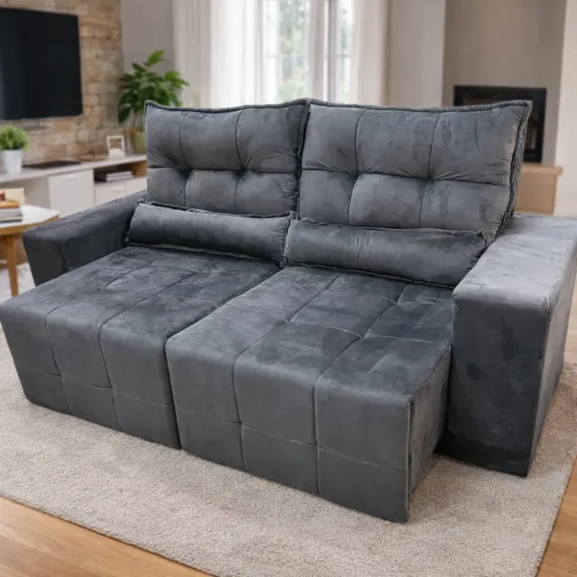 Características: Sistema retrátil e reclinável, armação em madeira reflorestada e revestimento em Veludo macio. Inclui 2 almofadas roletes decorativas.