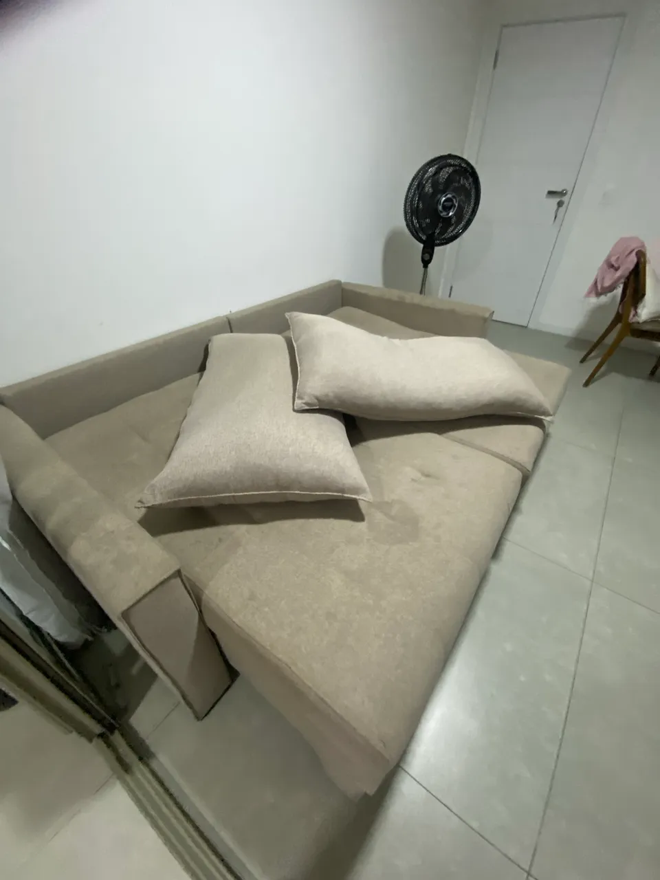 Sofá 3 lugares de linho. Comprado a um ano e meio pelo valor de 3.500,00. Retrátil, podendo dormir até duas pessoas. Design moderno. Precisa de uma reforma.
