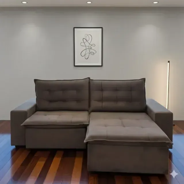 Apresentamos o sofá retrátil e reclinável Zuque, na elegante cor marrom. Perfeito para relaxar e aproveitar momentos de conforto, este sofá combina funcionalidade e design moderno. Ideal para a sua sala!