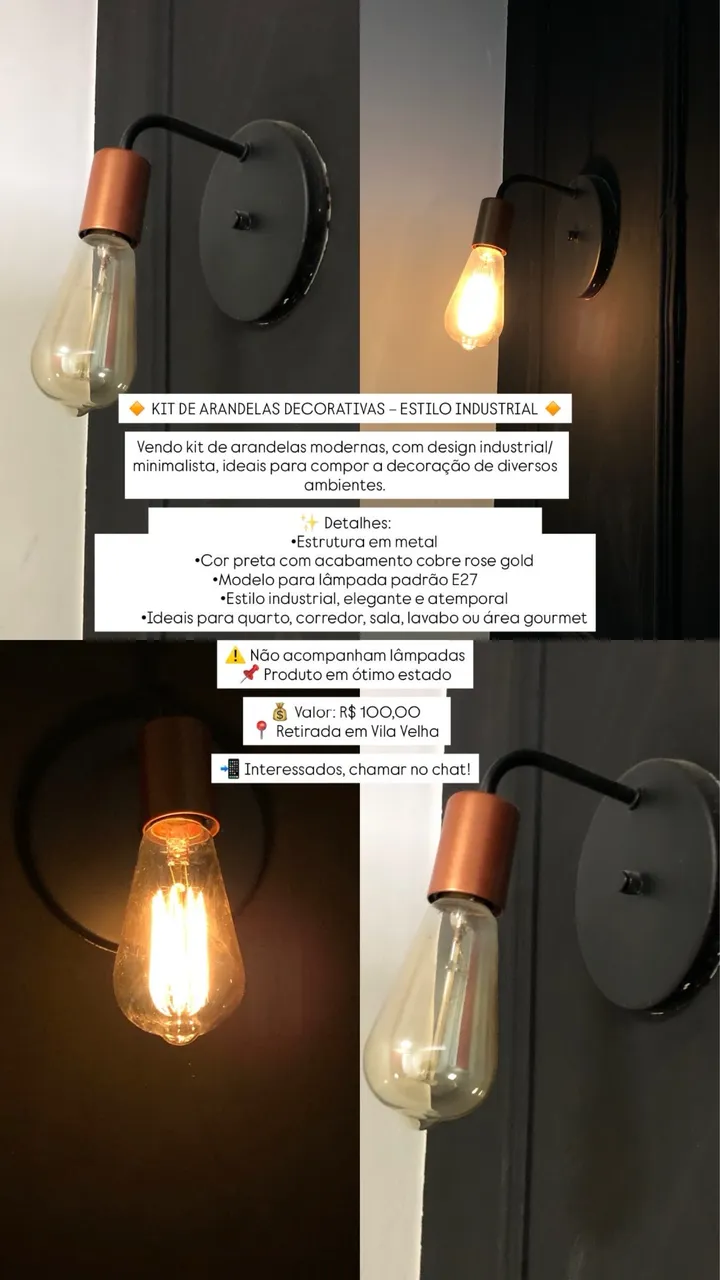 Kit de arandelas decorativas com design industrial e acabamento em cobre rose gold. Perfeitas para quarto, sala ou lavabo. Iluminação elegante e atemporal para diversos ambientes.