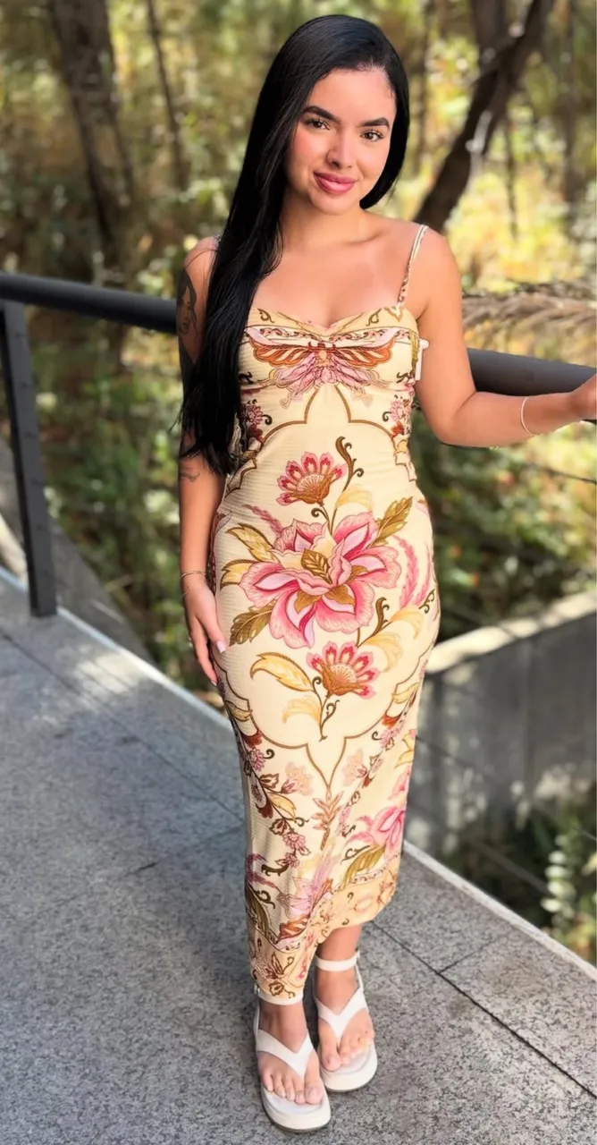 Vestido longo Farm com estampa floral vibrante. Perfeito para um look elegante e cheio de estilo, ideal para diversas ocasiões.
