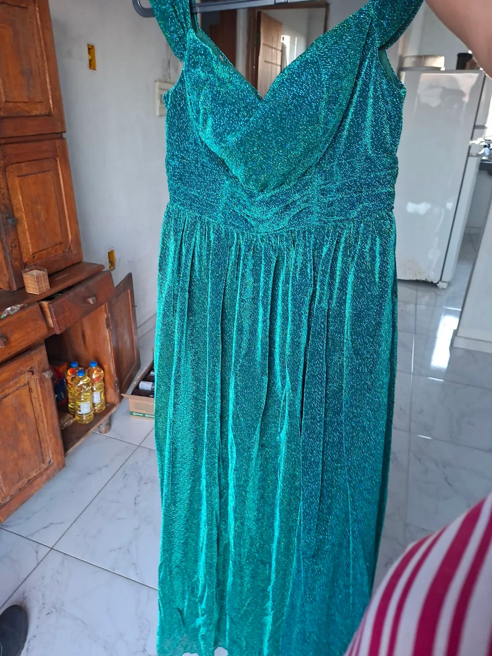 Vestido longo elegante, perfeito para ocasiões especiais. Seu tecido brilhante e caimento impecável garantem um visual sofisticado e marcante.