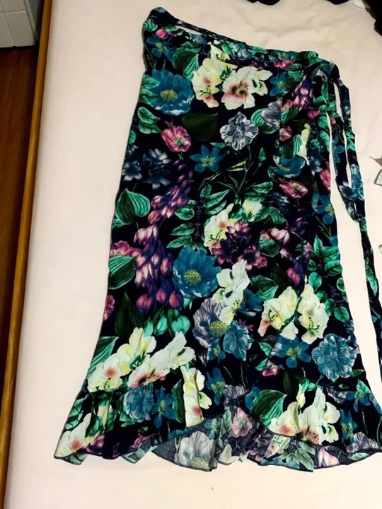 Saia estampada transpassada, com babado em volta, amarração do lado. Nova.