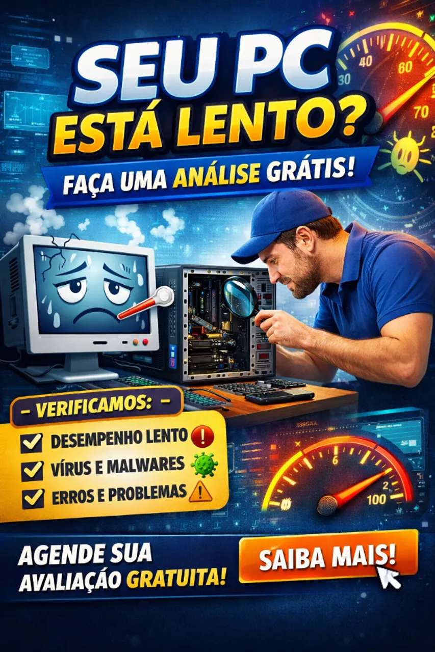? SERVIÇOS: ? Formatação, Limpeza e Remoção de Vírus ? Upgrade p/ SSD (seu PC 10x mais rápido!) ? Reparo de PCs e Notebooks ? Montagem de PCs (Gamer/Trabalho) ? Consultoria de TI (Compras, Wi-Fi, Backup) ? Suporte Remoto e Presencial.