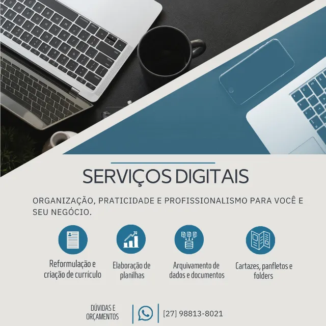 Ofereço serviços online com rapidez e profissionalimos para facilitar sua vida pessoal e seu negócio. ? Atendimento 100% online ? Entrega rápida ? Valores acessíveis ? Orçamento sem compromisso ? Me chama no WhatsApp e solicite seu orçamento!