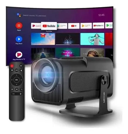 O projetor portátil HY320 Magcubic é uma opção de custo-benefício que oferece resolução nativa Full HD (1080p), Android 11 integrado, Wi-Fi 6 e Bluetooth 5.0. Com cerca de 390 ANSI lumens, é ideal para ambientes escuros, proporcionando uma imagem de até 150 polegadas com boa qualidade. Possui suporte articulado para rotação de 180°.