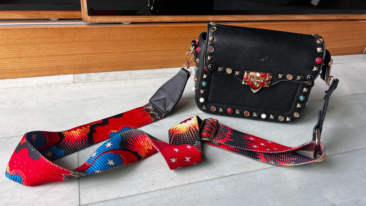 Linda bolsa de ombro com design moderno e detalhes coloridos na alça
