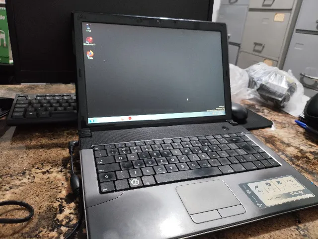 O notebook vai com Windows 7, tela e teclado funcionando normalmente, a bateria não