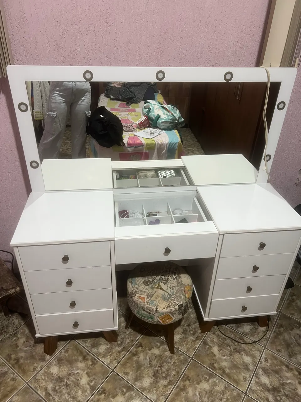 Vendo penteadeira, acendendo todas as luzes, todas gavetas boas funcionando perfeitamente, mando fotos melhores no whatsapp, esse valor com a baqueta!!