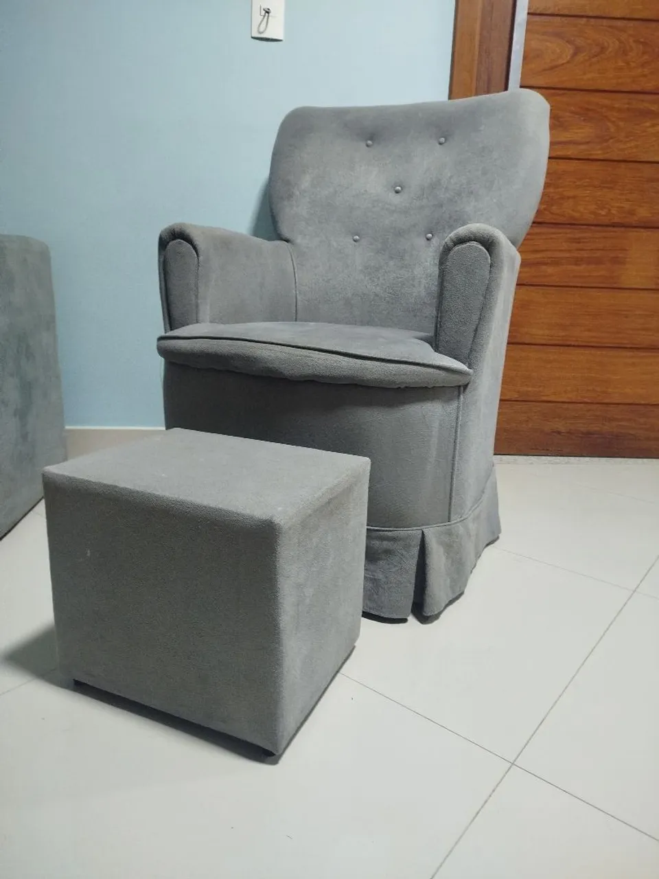 Poltrona de balanço+puff Desfrute do conforto e elegância desta poltrona cinza, perfeita para relaxar em grande estilo. Seu design acolhedor e charmoso adiciona um toque especial a qualquer ambiente.
